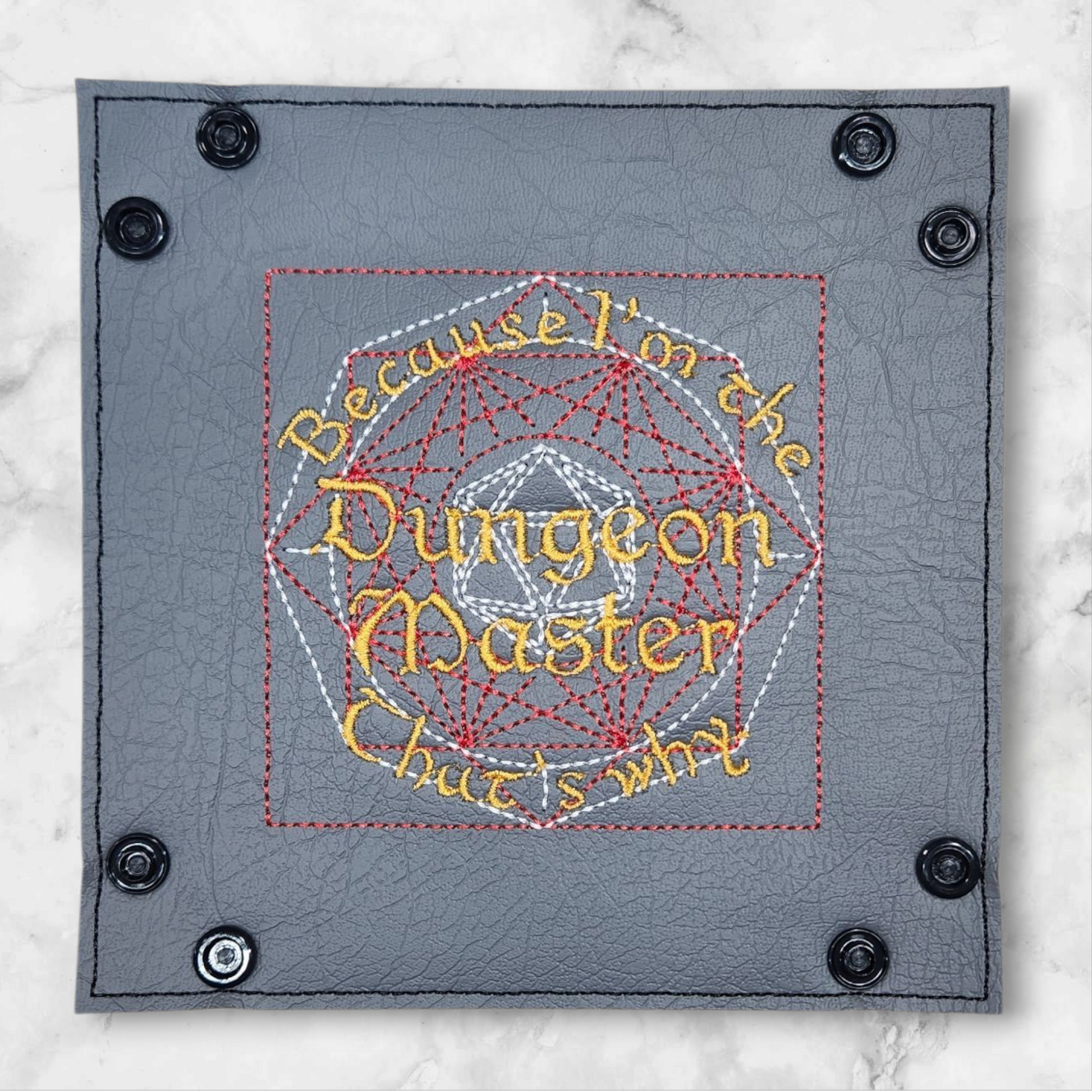 This is a handmade Dice tray embroidered on faux leather vinyl. The rolling area is 9.5cm x 9.5cm. The dice tray can be unclipped to lie flat for easy storage.
