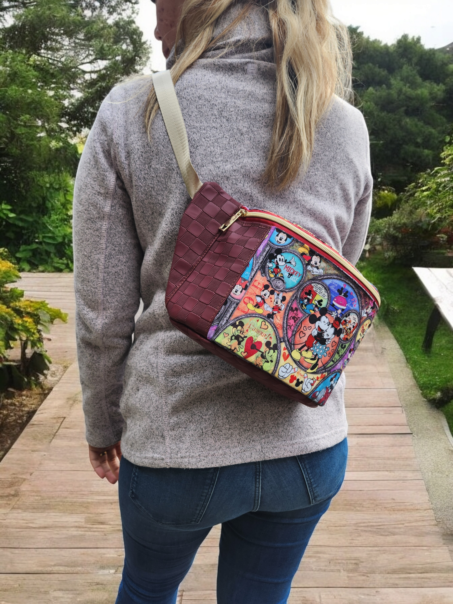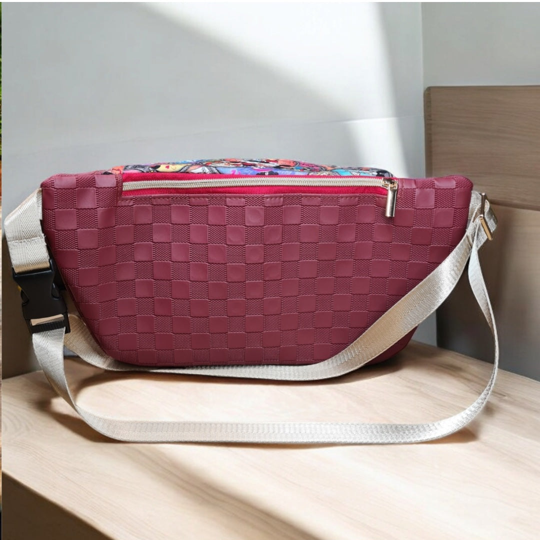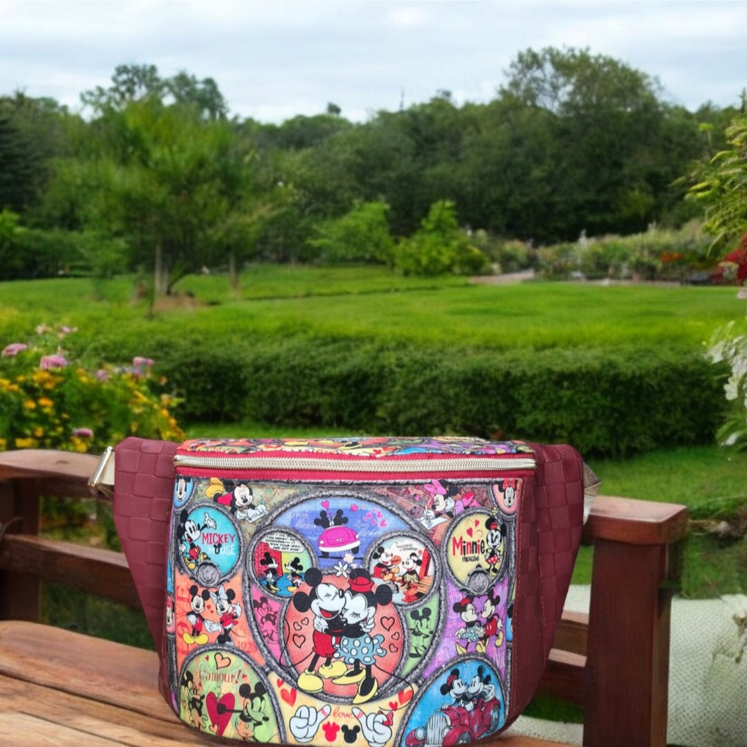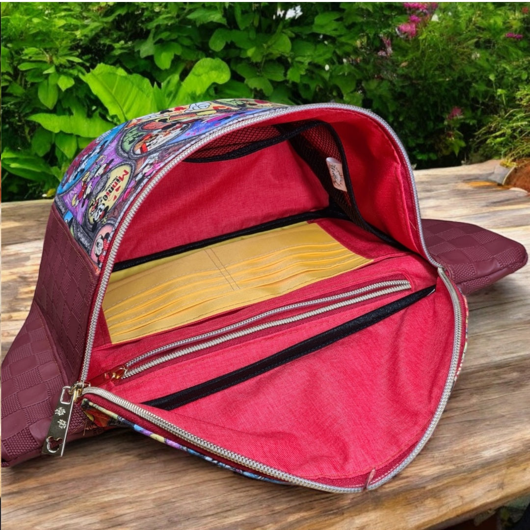 This bag is the PERFECT bag for a day in the theme parks (or to anywhere that requires you to be hand free). Choose to wear this as a back sling, or crossbody sling or even a bum bag. The internal size of this will amaze you, but even better is the amount of pockets! The main compartment is accessible by a zipper, making the bag fully enclosable, inside, there is a large mesh slip that has been divided into 3 pockets along the front, along the back interior, there is a zipper pocket, a slip pocket and 8 card slots. On the exterior, there is a large zipper pocket along the back to keep your valuables up close and personal to you, but still easily within reach. Measuring approximately 34cm wide x 17cm tall x 11.5cm deep.